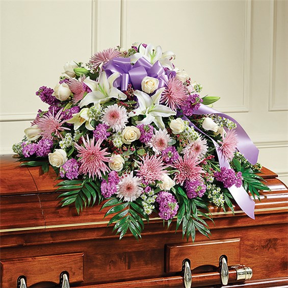 When we lose someone dear to us, we want to respond with a fitting gesture of respect and admiration. Our half casket cover, crafted with care and artistry by our expert florists with lavender cremones, mums, white roses, and accented with a lavender satin ribbon, is an unforgettable way to commemorate a lifetime of loving devotion. •Half casket cover arrangement of white roses, hybrid lilies and monte casino, lavender cremones, spider mums and stock, purple waxflower and fresh greenery; accented with a lavender satin ribbon •Arrangement measures approximately 16"H x 38"L x 26"D •Traditionally sent by the immediate family to the funeral home •Our florists use only the freshest flowers available, so colors and varieties may vary